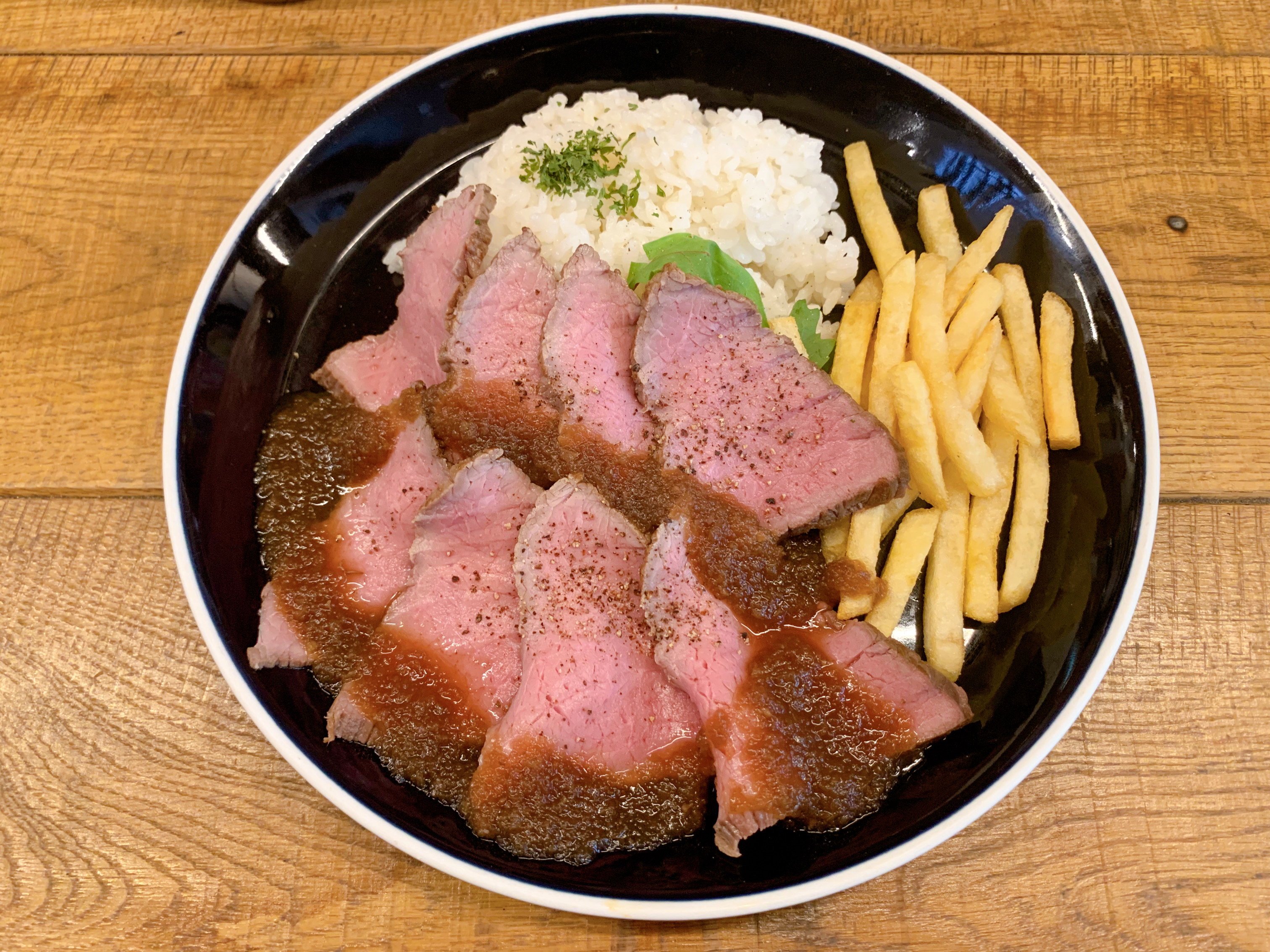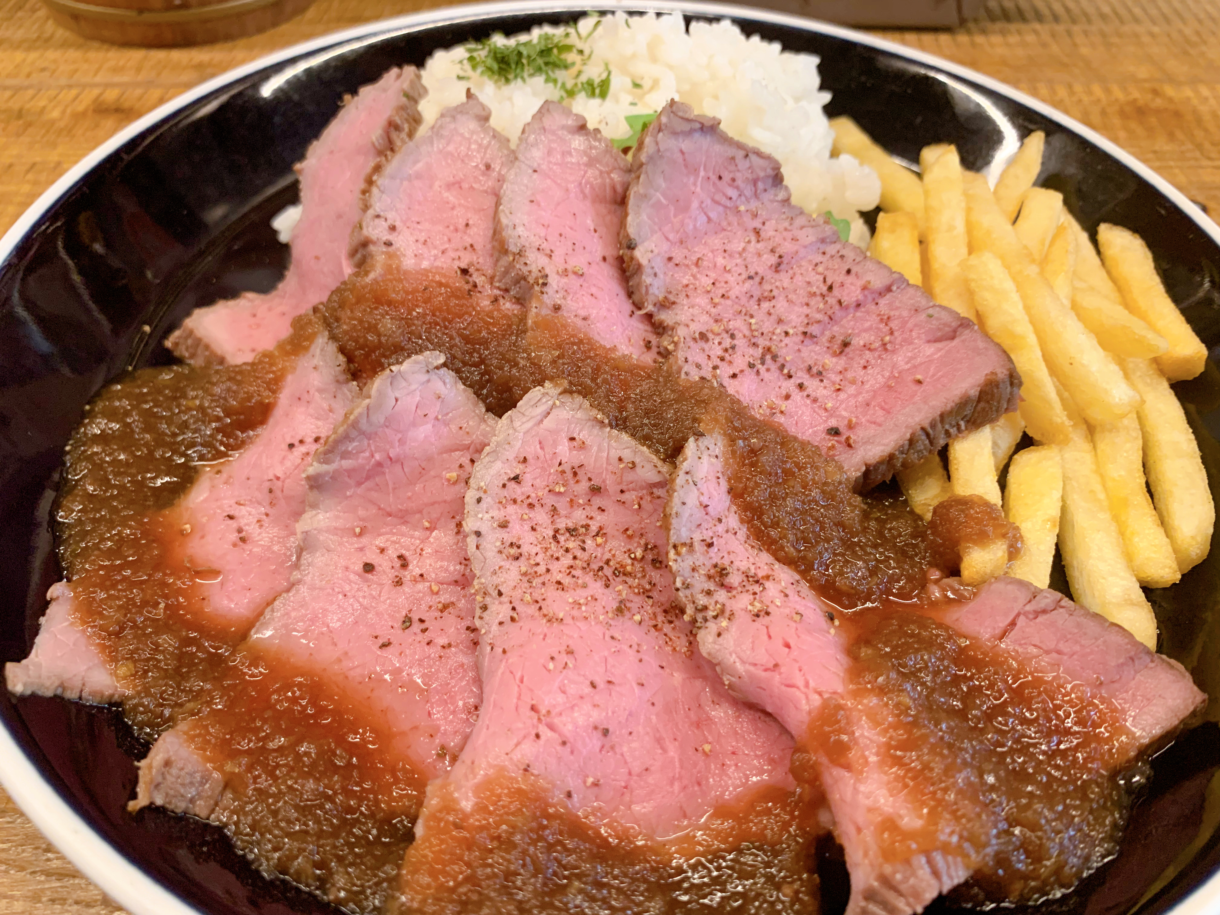 黒いプレートの上には、薄くスライスされたローストビーフが美しく並べられており、中心には甘めのタレがかかっています。付け合わせには白米とフライドポテト、彩りのレタスが添えられており、ワンプレートで見た目にもバランスのとれた仕上がり。木目調のテーブルと黒い器のコントラストもあり、食欲をそそるビジュアルでした。