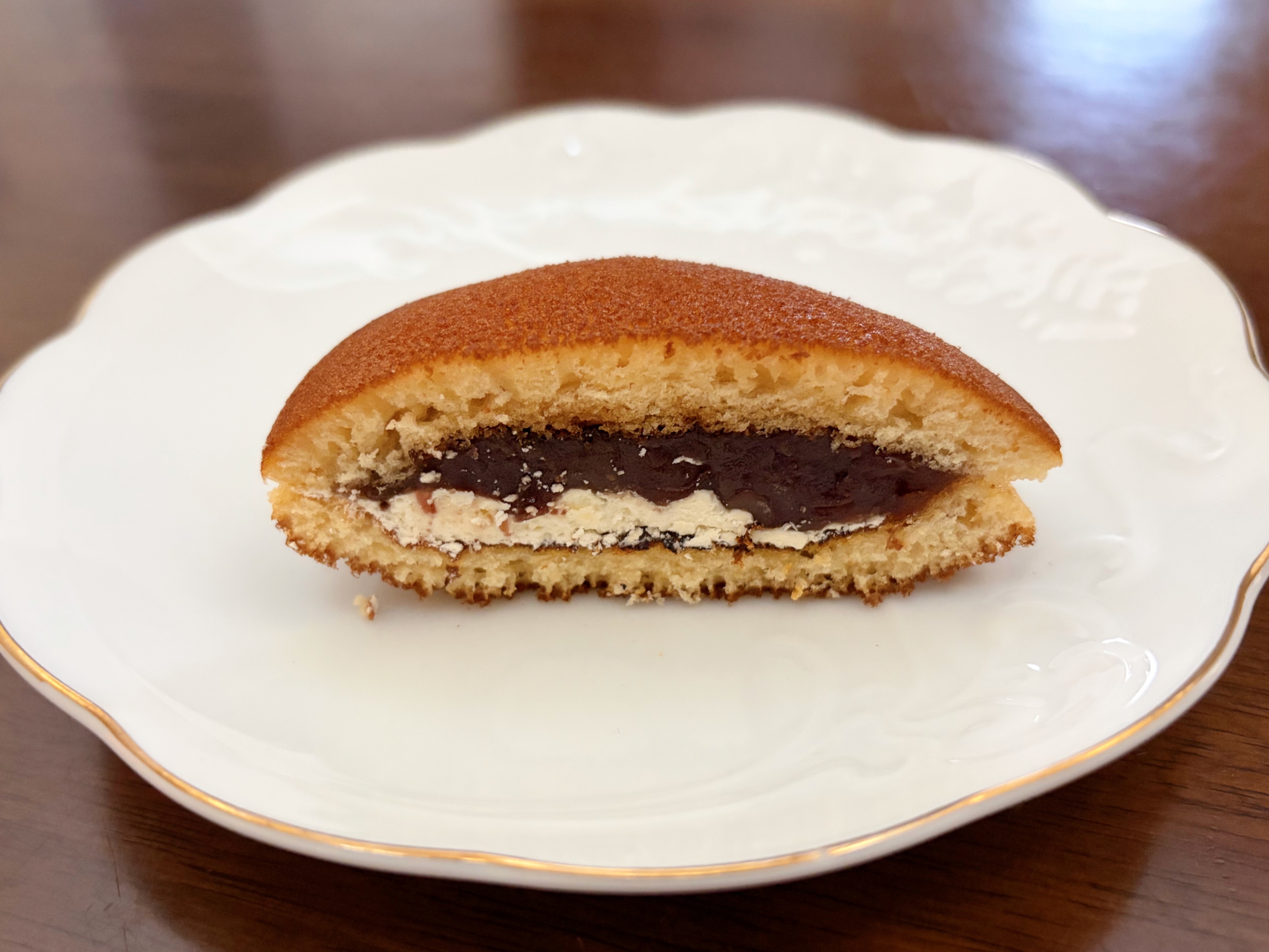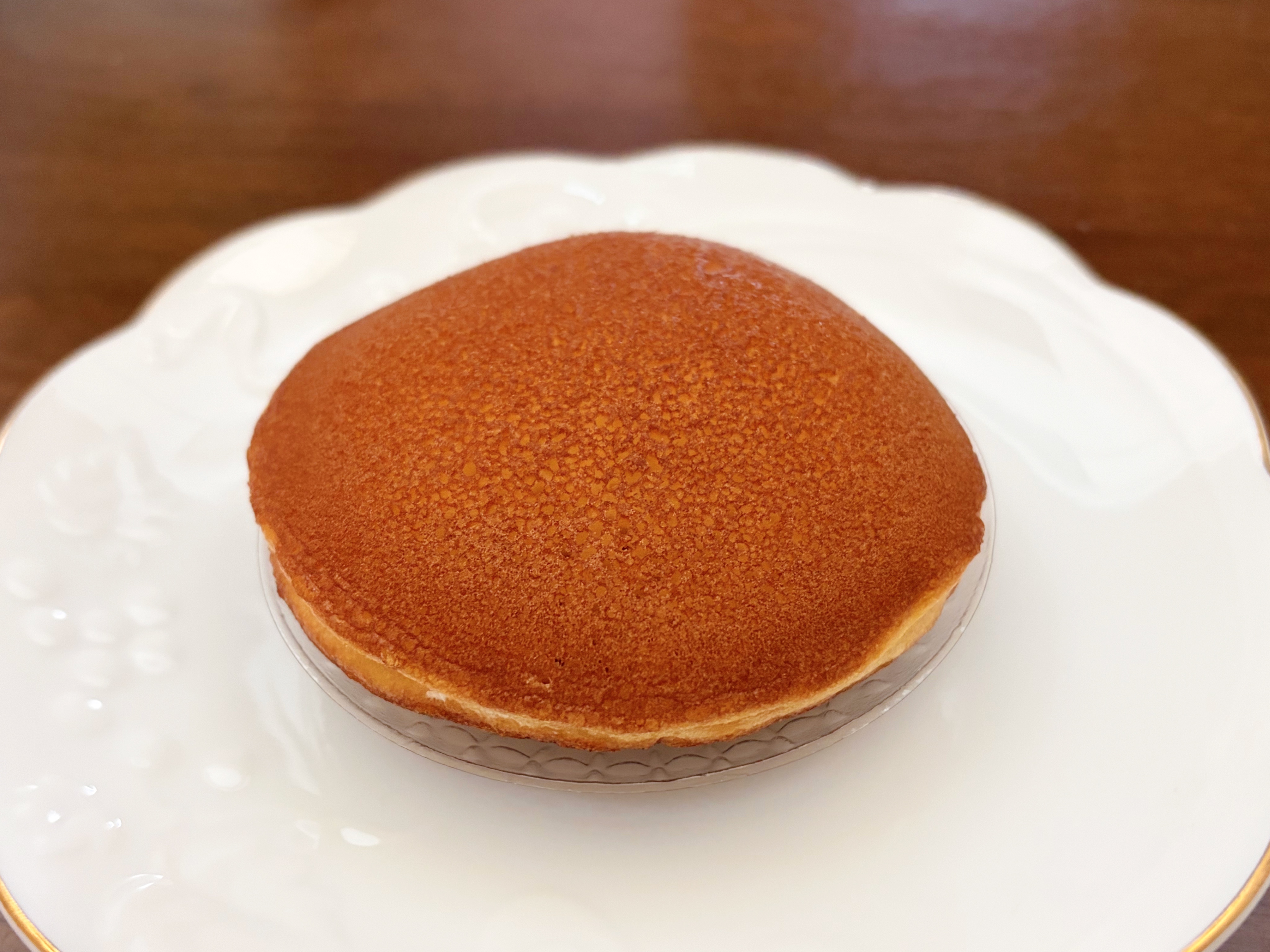 袋から取り出してみると、ころんと丸みのあるフォルムが印象的。表面はこんがりときれいな焼き色がついていて、つやは控えめながらも、とてもなめらかな見た目です。どらやきらしい素朴さがありつつ、整った形から丁寧に作られていることが伝わってきます。