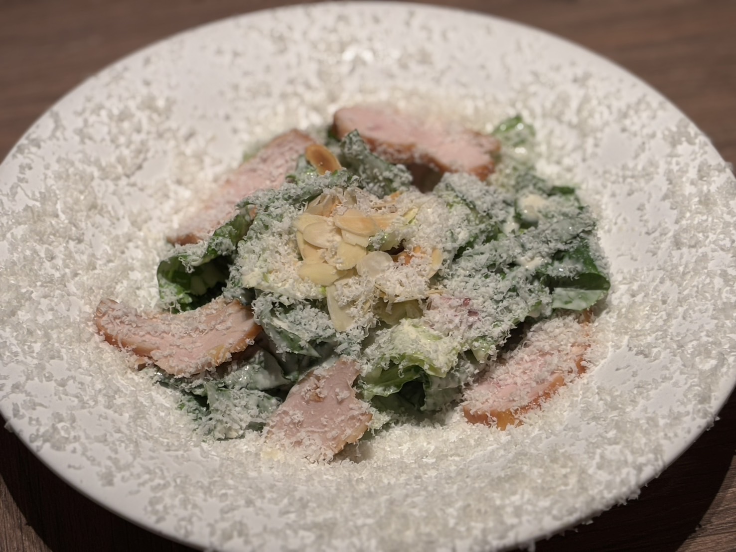 まず最初に注文したのが「鶏むね肉の“白雪”シーザーサラダ」。レギュラーサイズは1,078円(税込)、一回り小さいピッコロサイズは858円(税込)で用意されています。