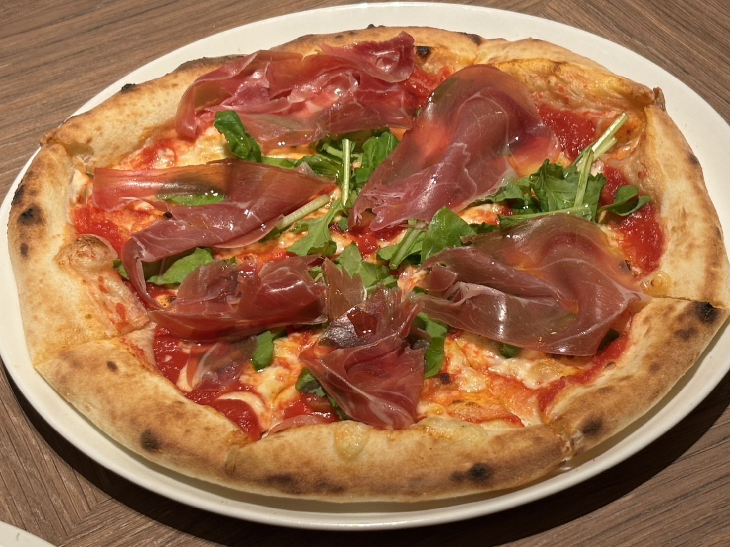 最後にいただいたのは「生ハムとルッコラのピッツァ」(1,628円(税込))。生地は本格的なナポリ風で、外は香ばしく焼き上げられ、中はもっちりとした食感。焼き立てならではの香りが食欲をそそります。