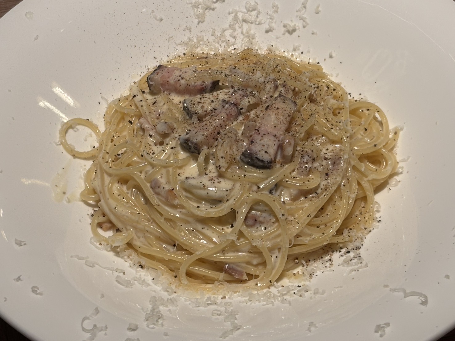 パスタはクリームソースをベースにしており、ひと口食べると卵の濃厚なコクとクリームのなめらかさが広がります。濃厚でありながら重たさはなく、最後まで飽きずに食べ進められる絶妙なバランス。ベーコンの旨味と黒胡椒のピリッとした風味がアクセントになり、全体を引き締めています。