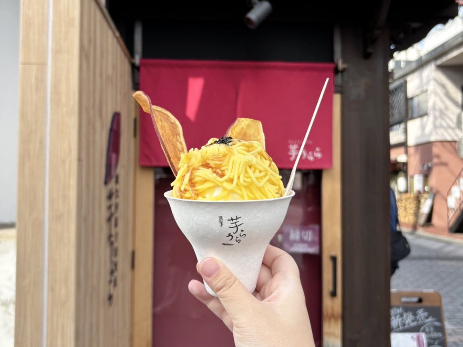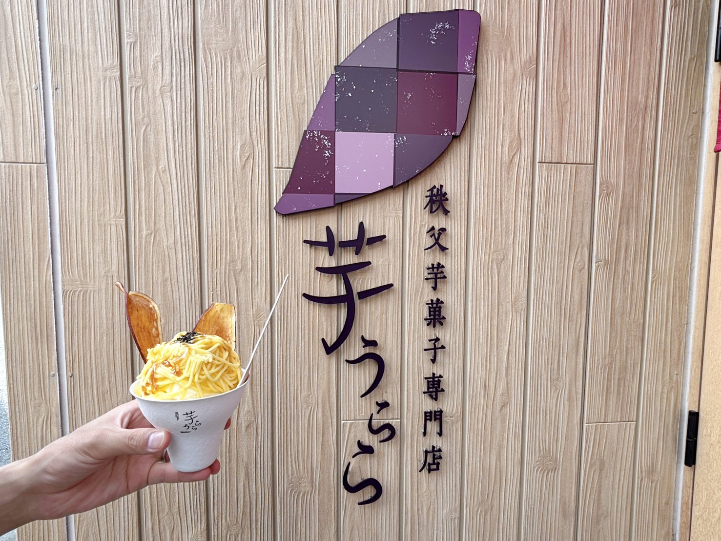 秩父散策の途中で立ち寄ったのが、芋菓子専門店「芋うらら」。木目調の外観と、えんじ色の暖簾が目を引くお店です。お芋スイーツがずらりと並ぶ中で、今回お目当てにしていたのがカップタイプの「いもんぶらん」。写真映えもばっちりな人気メニューをいただいてきました。