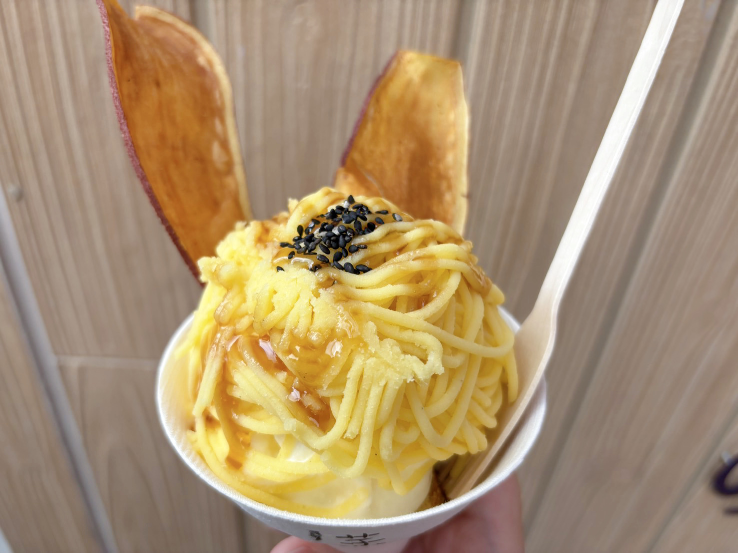 カップにこんもりと盛られたイモンブランは、まずビジュアルが最高。細く絞られたさつまいもクリームが山盛りになっていて、その上には黒ごまがトッピング。さらに両サイドにはパリッとしたさつまいもチップスが耳のようにささっていて、とても可愛らしい見た目です。