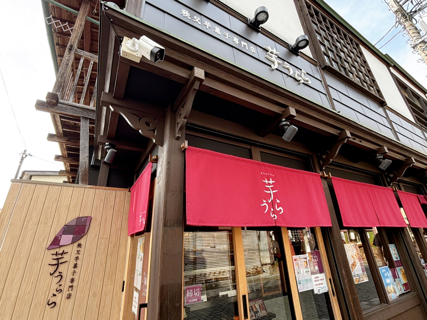 「芋うらら」は、その名の通りさつまいもメインのスイーツが楽しめる芋菓子専門店。店頭には焼き芋やスイートポテト、ソフトクリームなど、さつまいも好きにはたまらないラインナップが並んでいます。観光地・秩父の街並みに溶け込む和の雰囲気で、ふらっと立ち寄りたくなる空気感も魅力です。