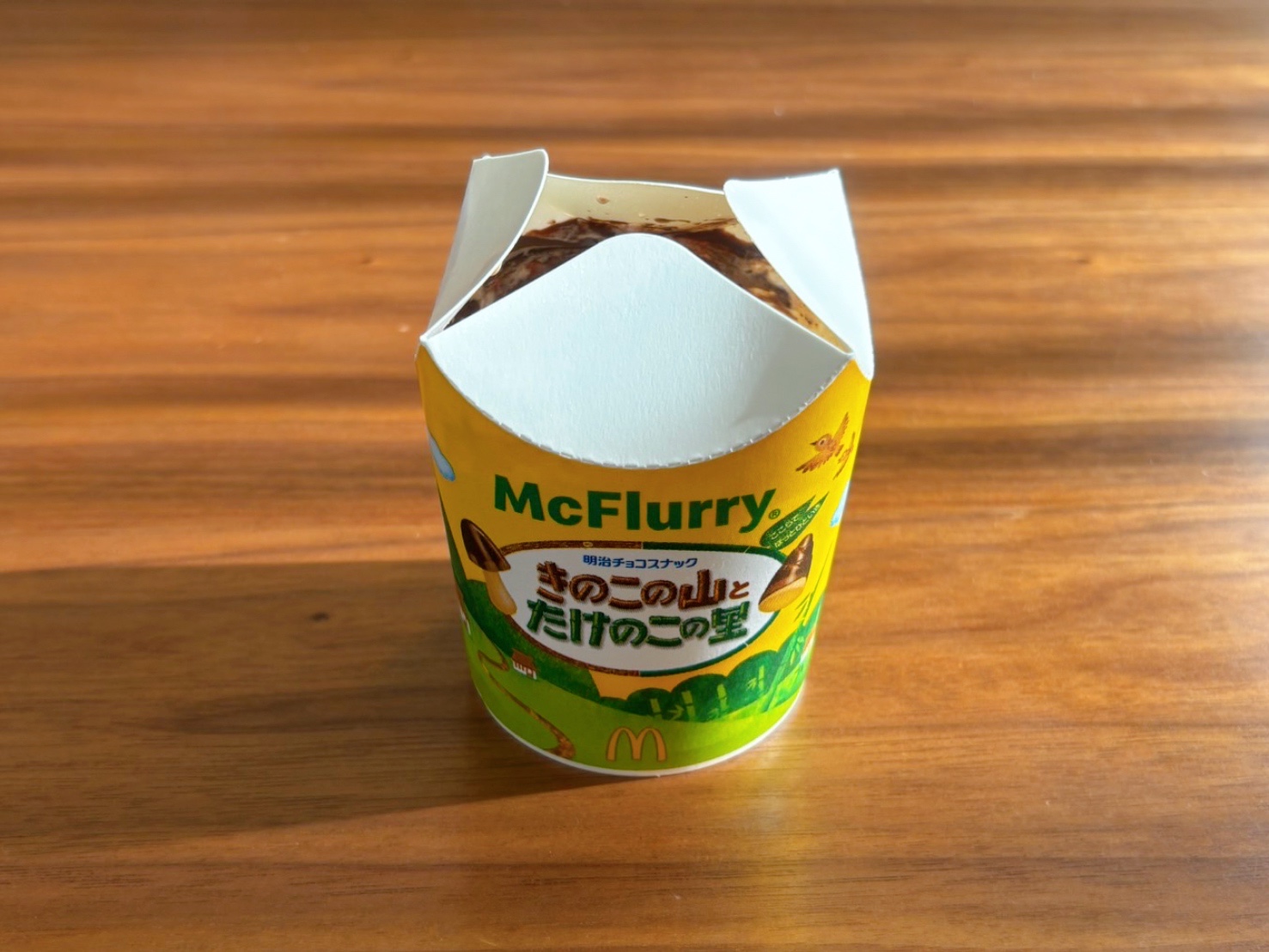 1月21日(水)から期間限定で新登場したのが、明治の人気チョコスナックを主役にした「マックフルーリー きのこの山とたけのこの里」。カップの中には“丸ごとそのまま”入った「きのこの山」と「たけのこの里」、そして口どけの異なる2種類のチョコソースがたっぷり混ぜ込まれています。名前を聞いただけで甘党のテンションが上がる、コラボ感強めの一杯です。