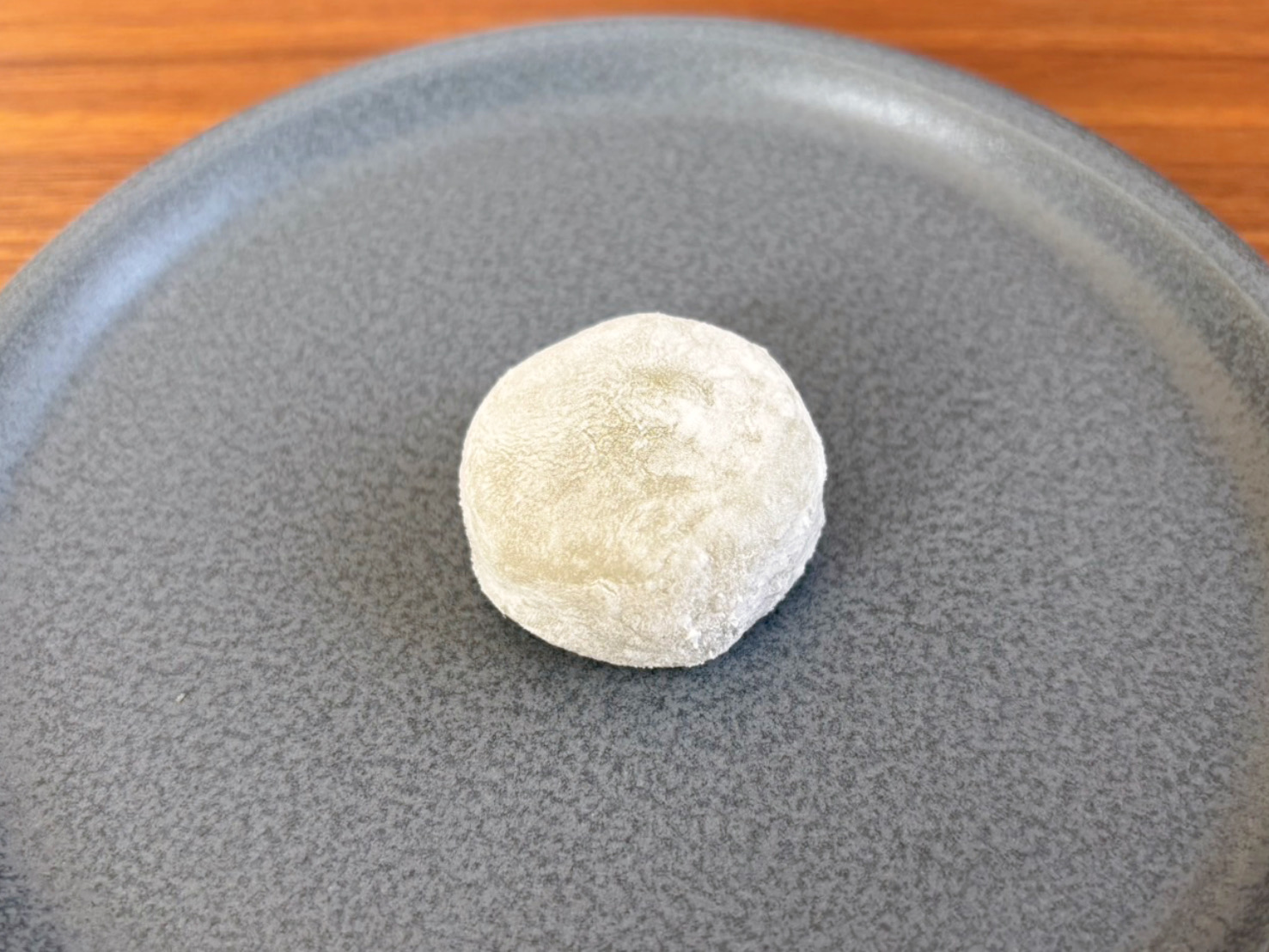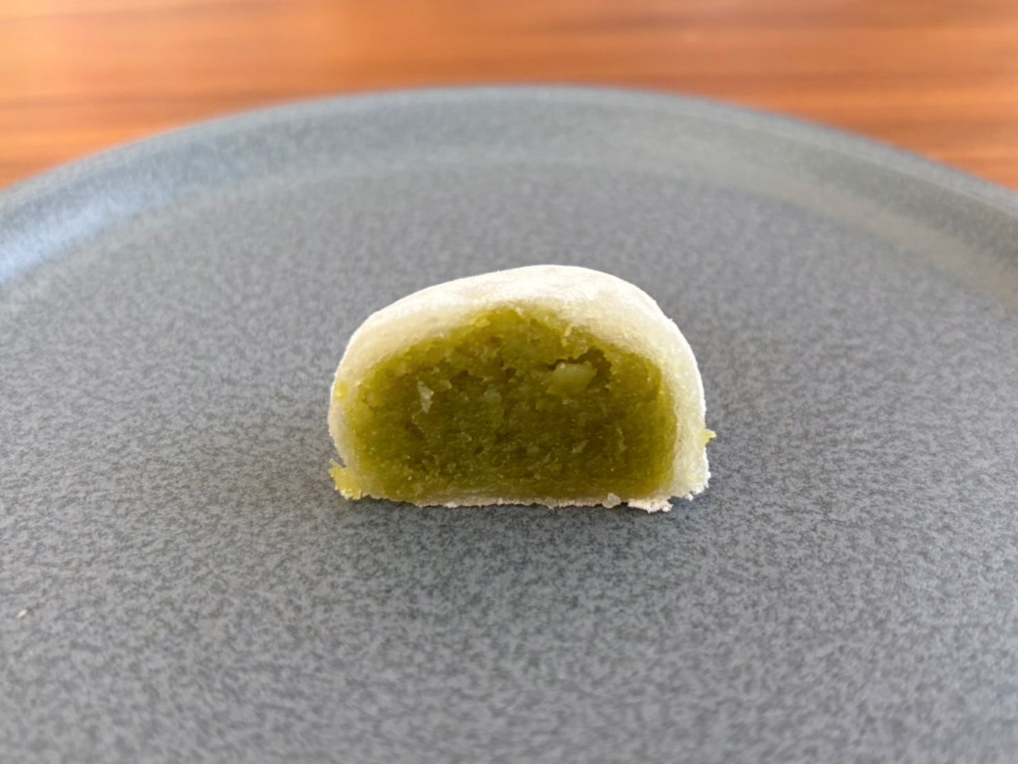 断面を見ると、鮮やかな緑色のずんだ餡がぎっしり詰まっているのがわかります。口に入れると、枝豆のほっくりとした風味が広がり、ほどよい甘さが後を引きます。舌触りはなめらかでありながら、ずんだ特有のつぶつぶ感も残っていて、枝豆らしさをしっかり感じられる仕上がりです。お餅部分は柔らかく、ずんだ餡との相性が抜群。和菓子らしい素朴さと上品さが同居しています。