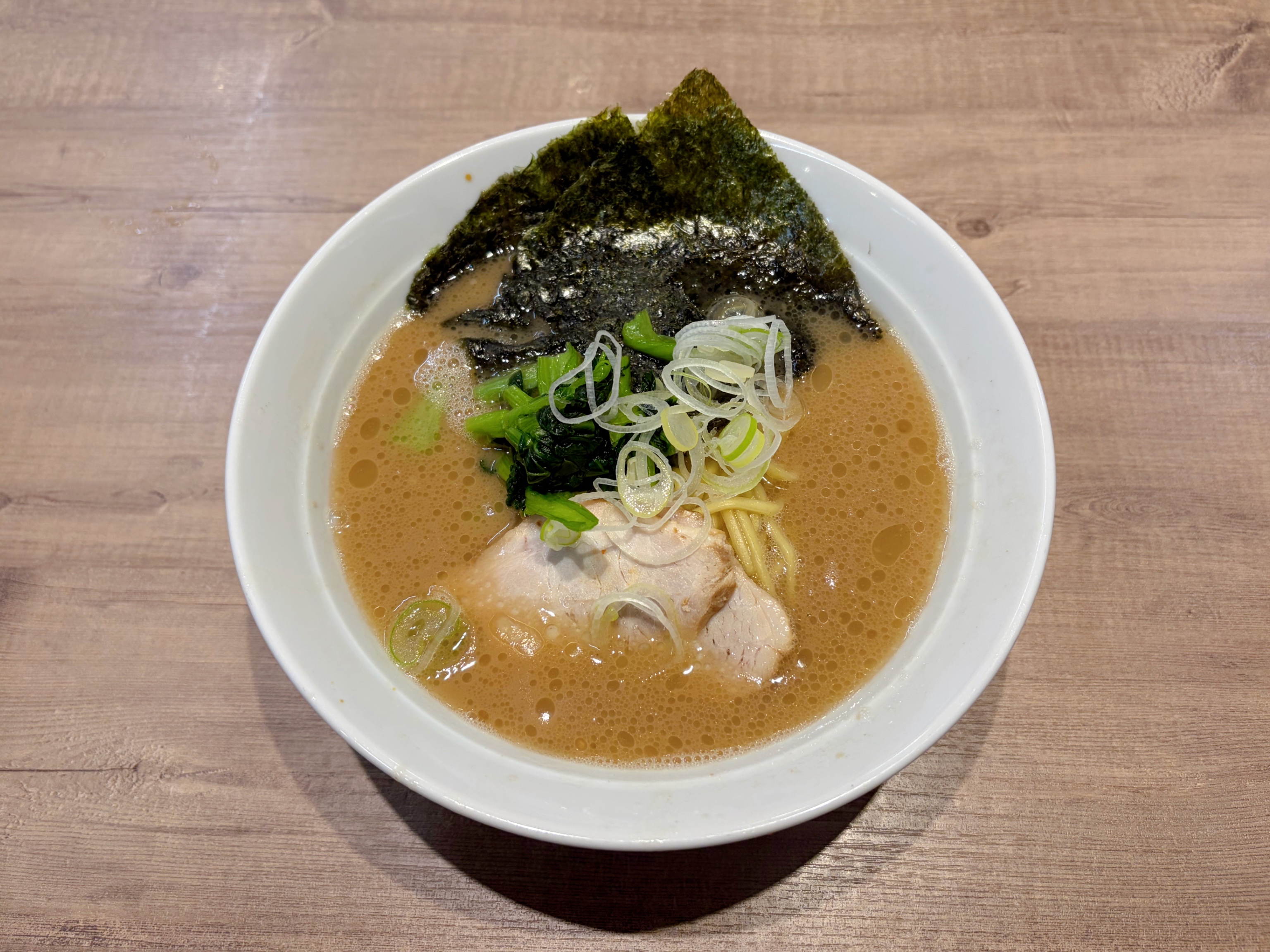 着丼してまず目に入るのは、どーんと立った海苔の存在感。中央には青菜(小松菜系)と白ねぎがこんもり盛られ、チャーシューもきちんと鎮座。スープ表面には細かな脂が浮いていて、見るからにコクがありそうな色味です。全体的に王道の“豚骨醤油”らしい安心感があって、食欲を直撃してきます。