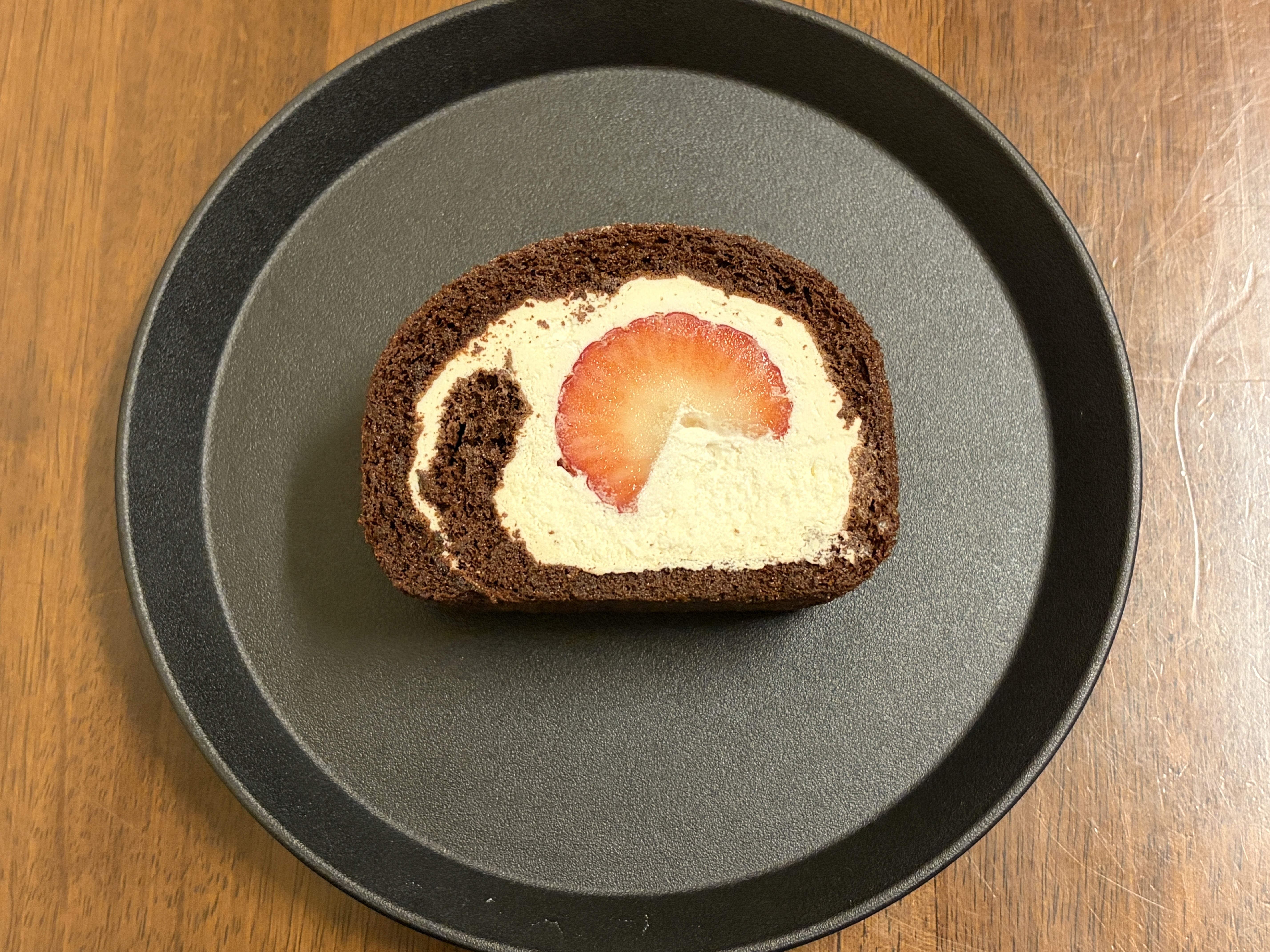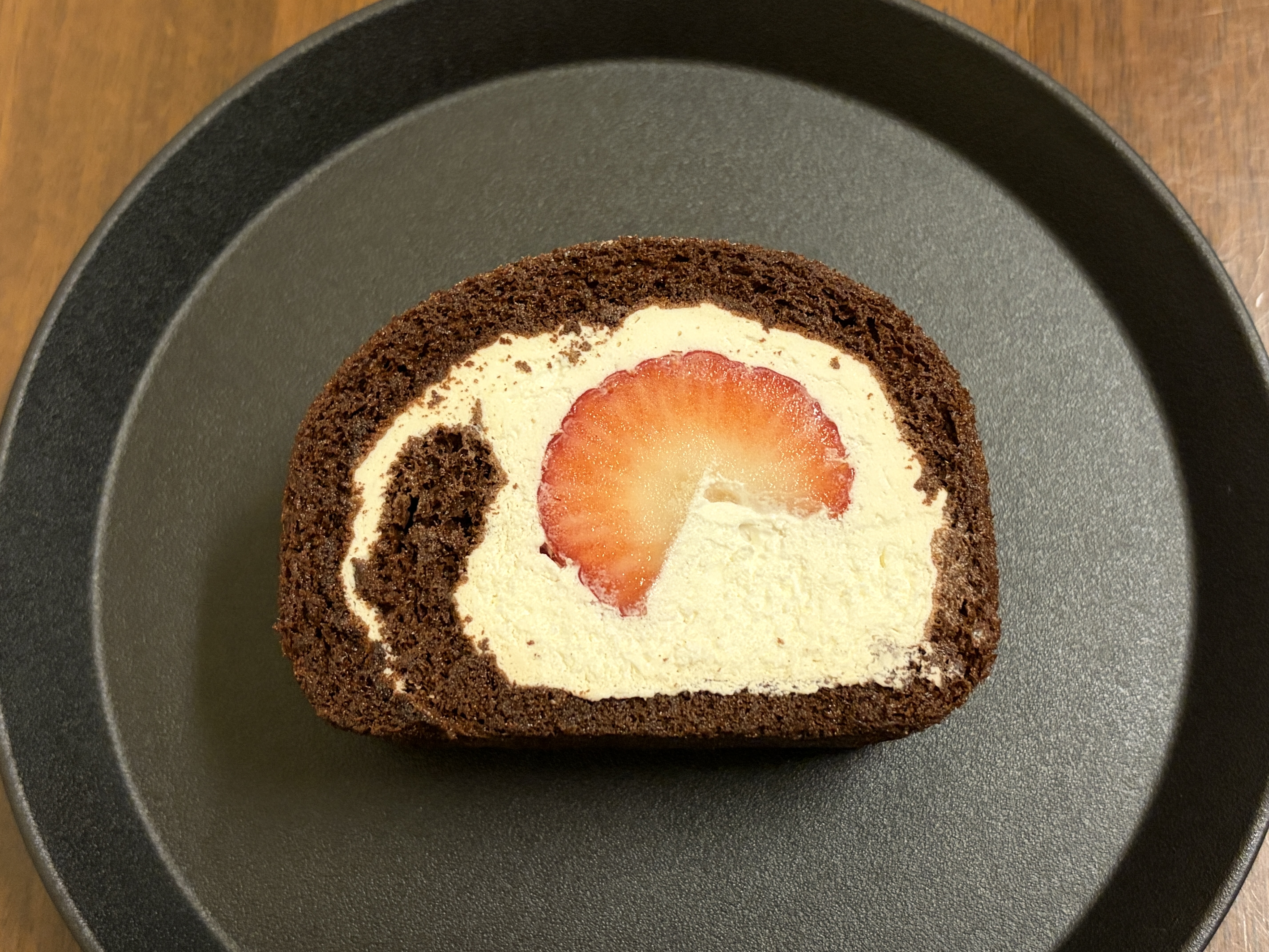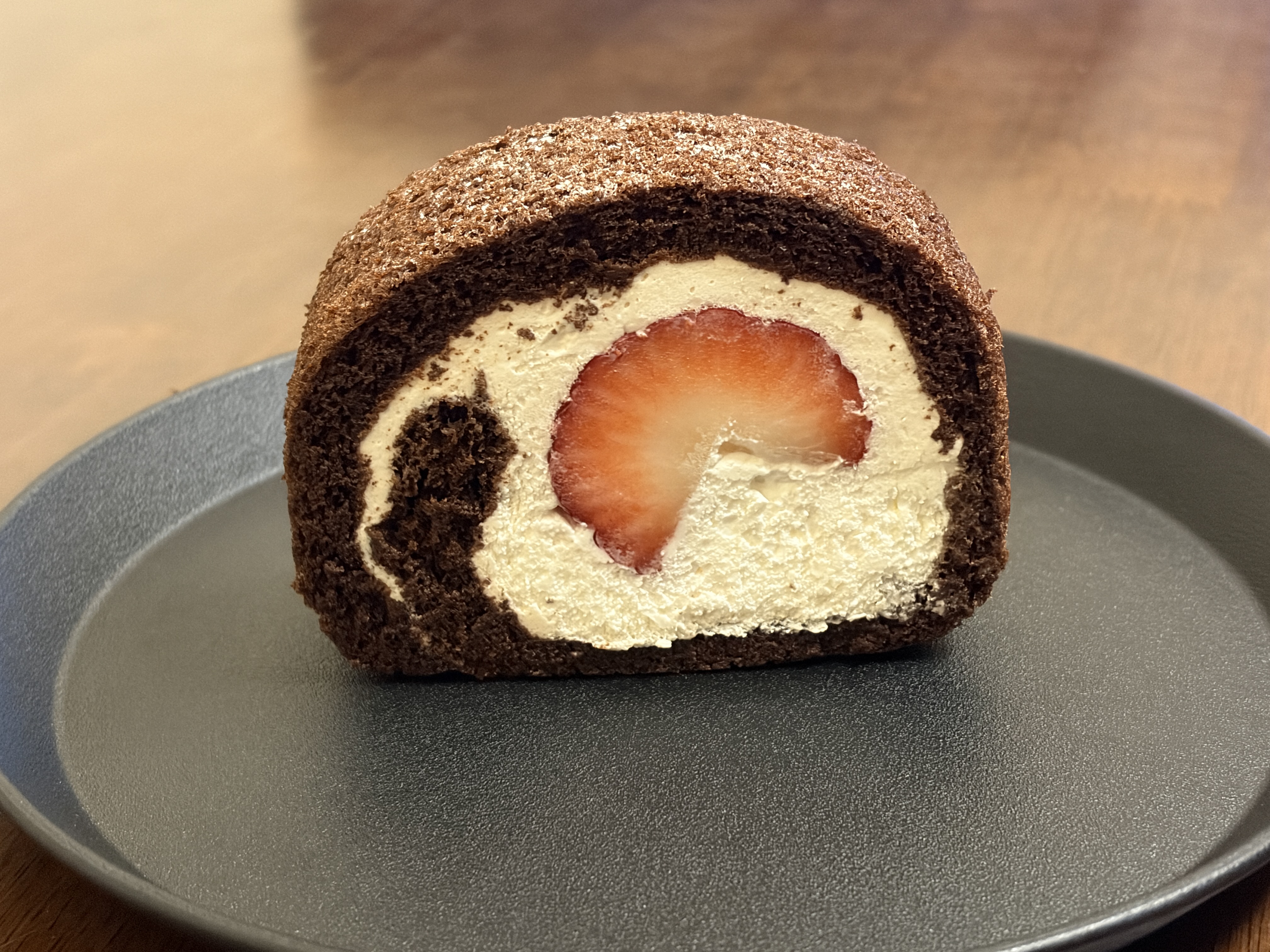 実際にカット面を見ると、ふんわり巻かれたチョコレートカラーの生地の中に、やさしい色合いの生クリームがたっぷり。その中央には、赤くみずみずしいいちごが一粒入っていて、シンプルながら華やかさがあります。派手すぎない上品な見た目で、老舗フルーツ専門店らしい落ち着きのあるロールケーキという印象でした。
