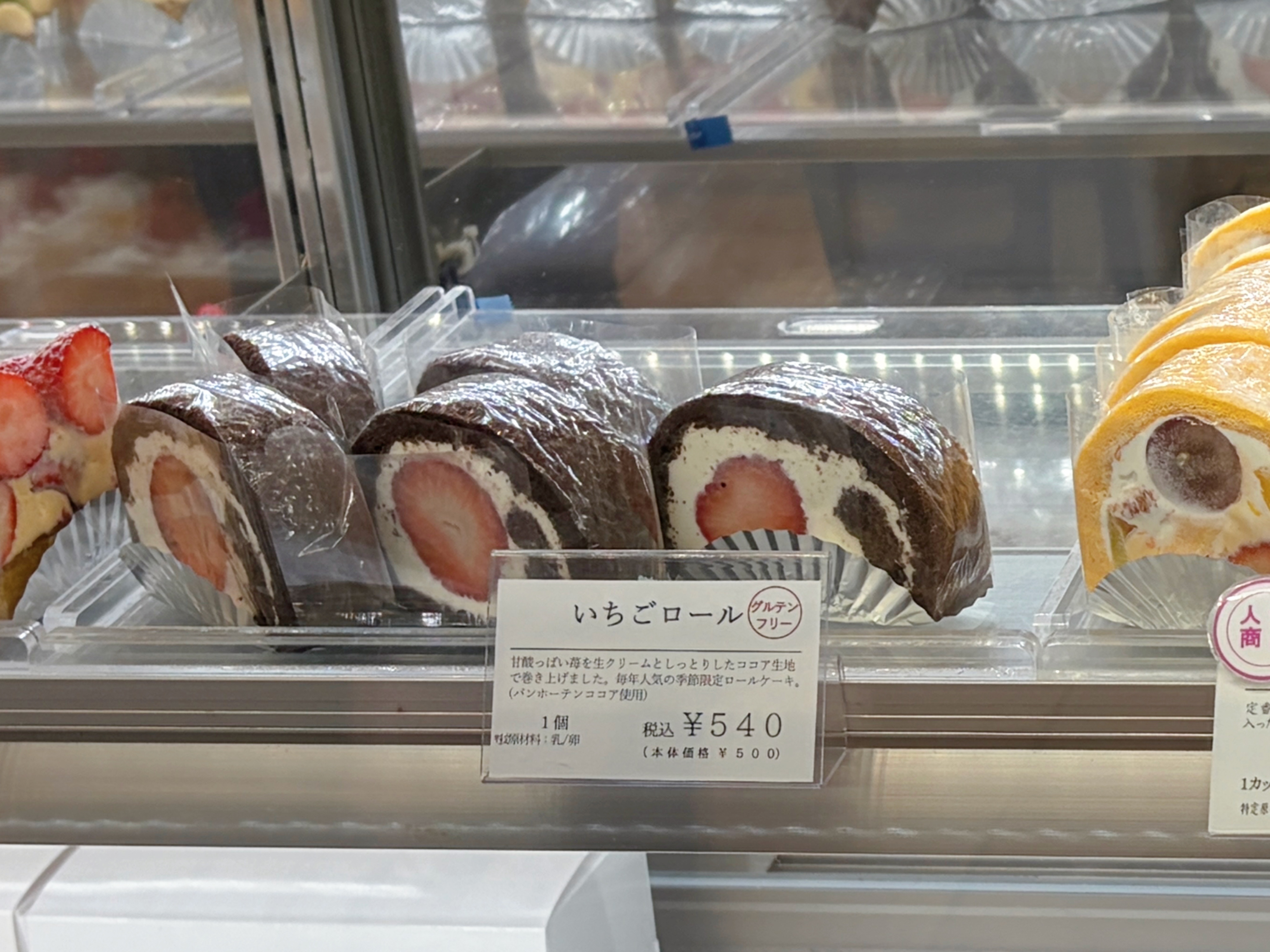 公式SNSによると、このいちごロールは小麦粉を使用せず、ココアのみで焼き上げたビターな生地に、甘酸っぱい生のいちごとフレッシュな生クリームを合わせた一品とのこと。さらにバンホールココア使用、そしてグルテンフリーという点も魅力です。価格は540円(税込)。見た目の華やかさだけでなく、素材へのこだわりも感じられるロールケーキでした。