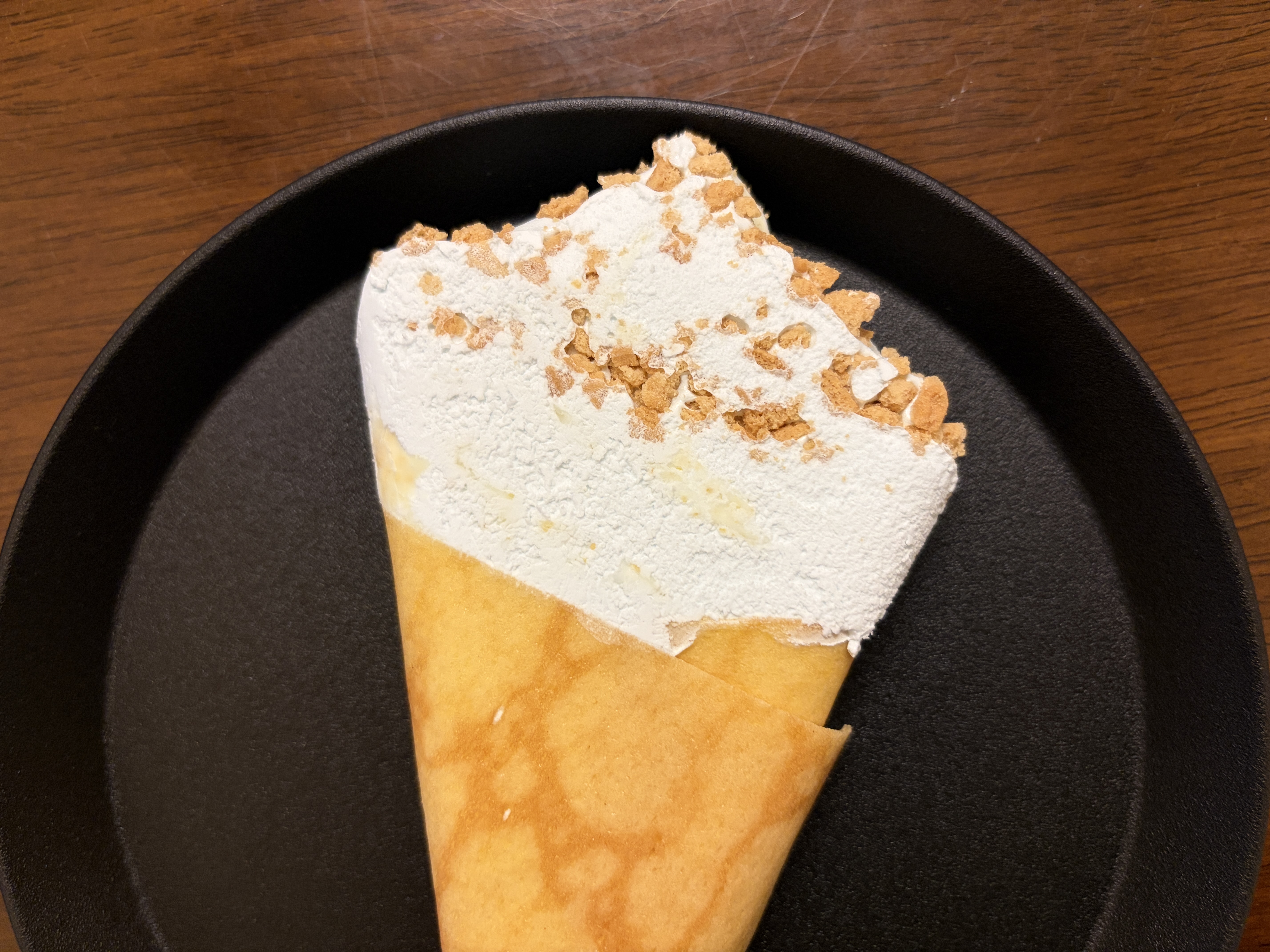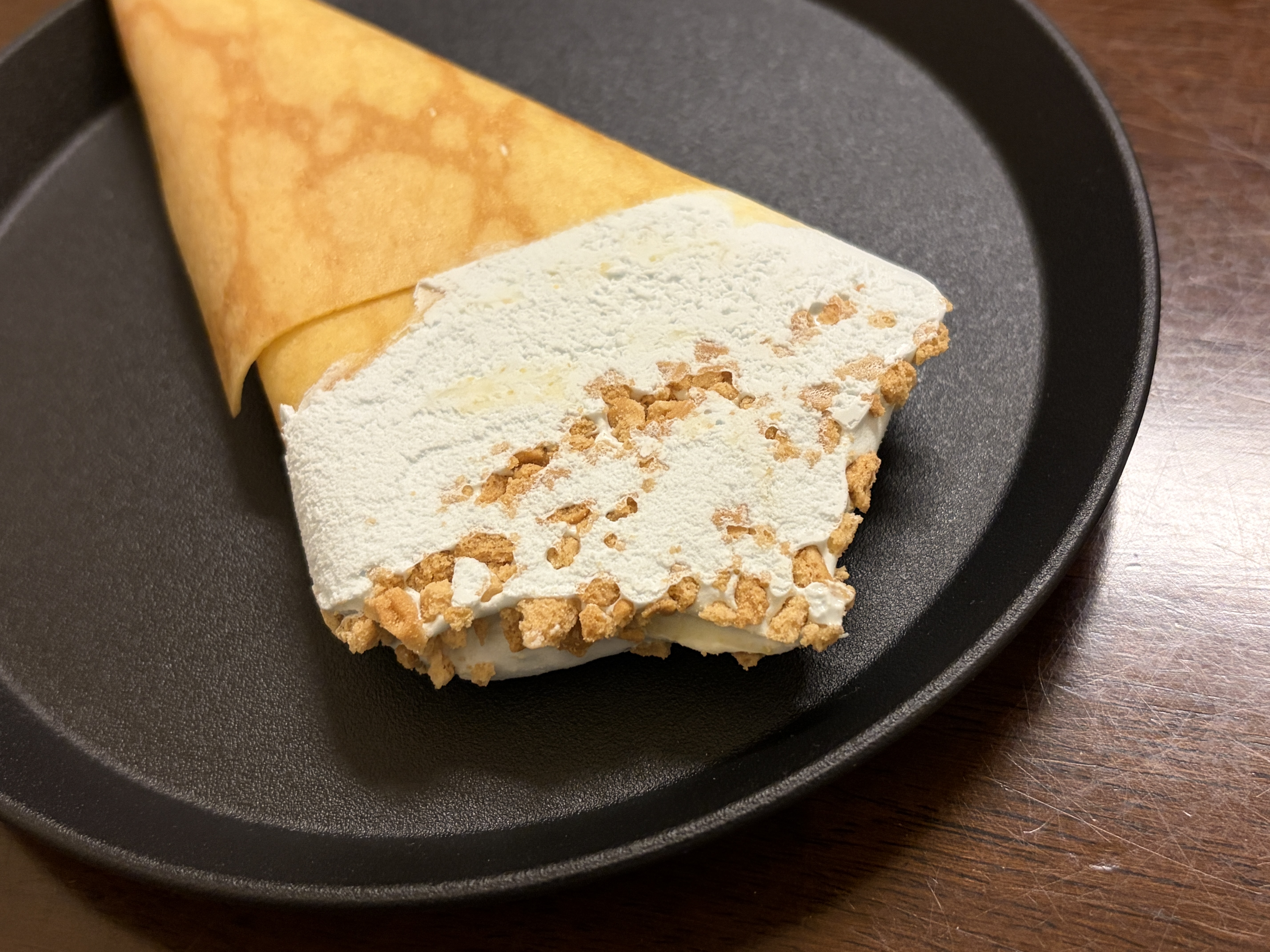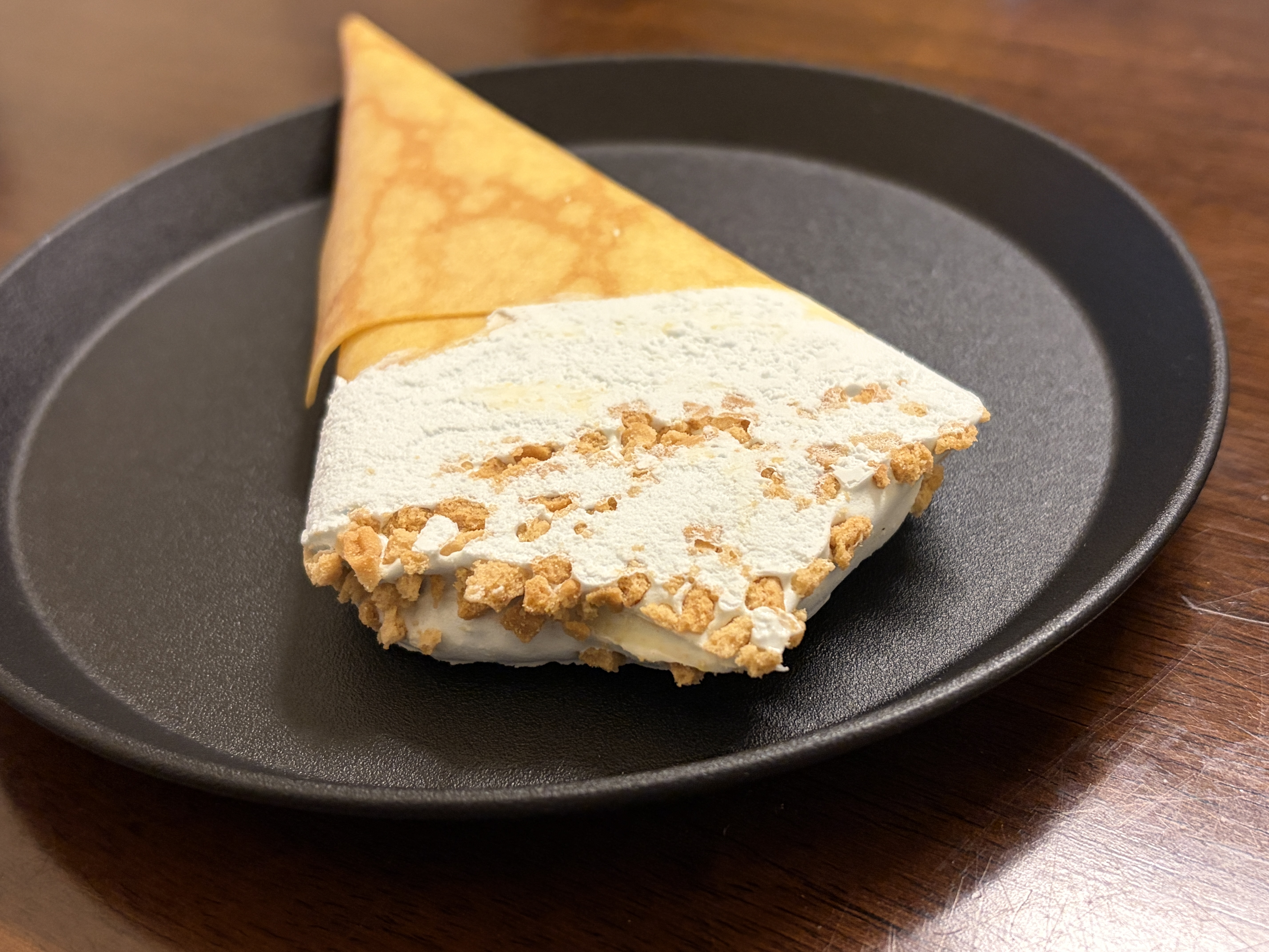 中のアイスはシュガークレープ風アイスというだけあって、香りも甘さもやさしめ。バター感が前に出るというより、砂糖のふんわりした甘みで「クレープってこういう安心感あるよね」と思わせてくれる味わい。濃厚すぎないので、甘いものが得意じゃない日でも食べやすいタイプでした。