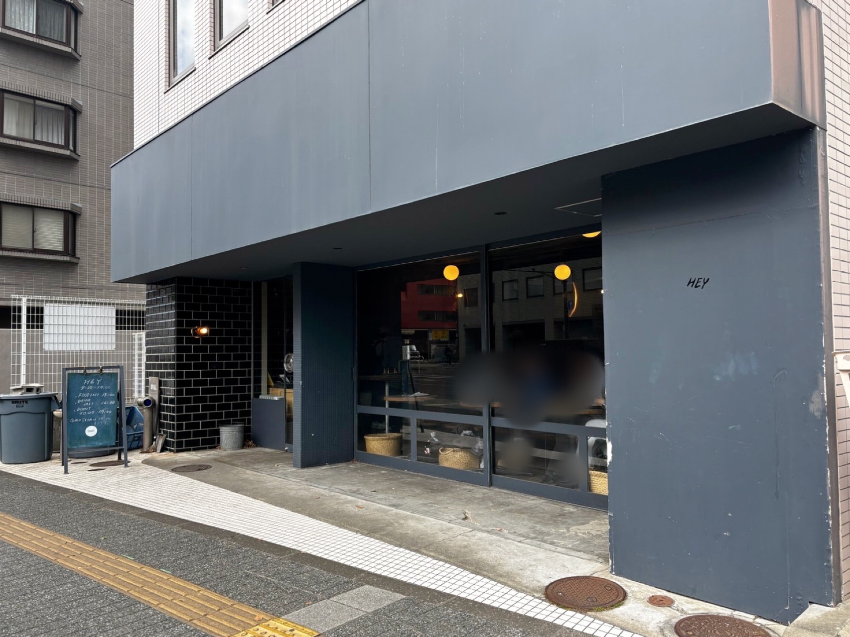 無機質なグレーの外観に「HEY」のロゴが入っていて、全体的に落ち着いた雰囲気でした。中の様子が外から少し見えるのも入りやすくていい感じです。