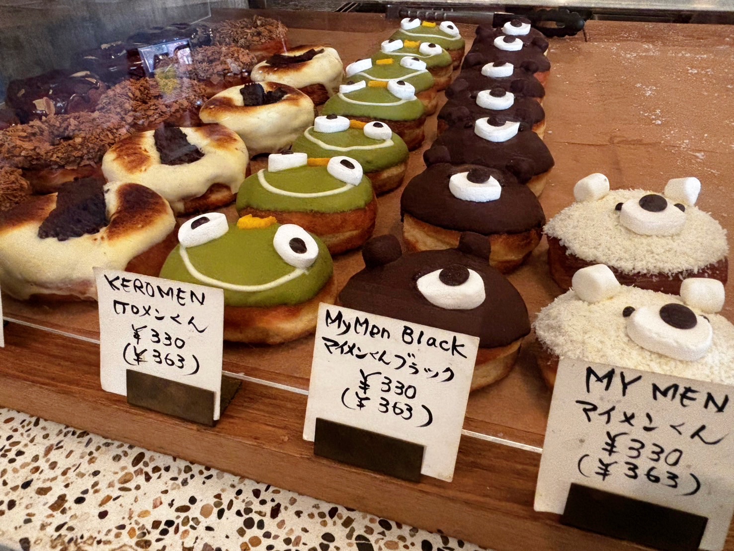 今回のお目当てだった「MYMEN BLACK」のほかにも、カエルの顔をモチーフにしたものや、白いクマのような見た目のドーナツなど、遊び心のあるラインナップが印象的でした。