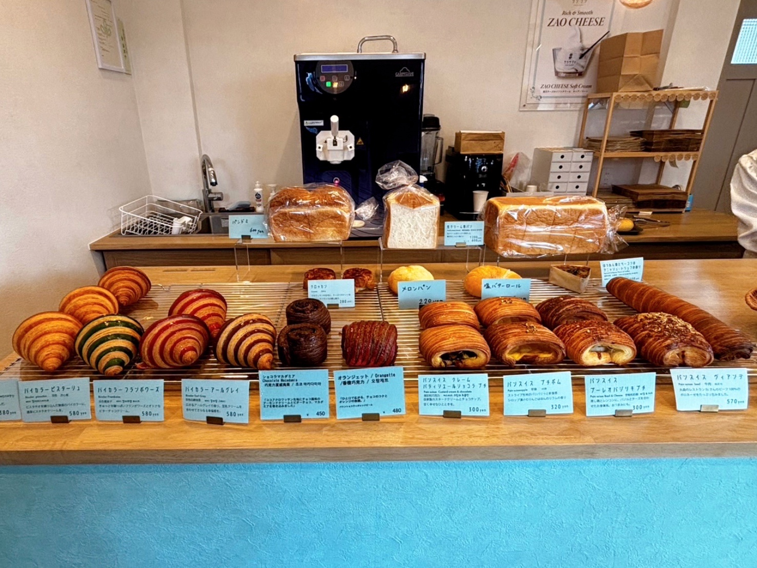 外観は爽やかなカラーが印象的で、看板や旗も含めて世界観が統一されていてとにかく可愛い…!店内も明るくて、パンがずらっと並ぶカウンターが映える空間でした。