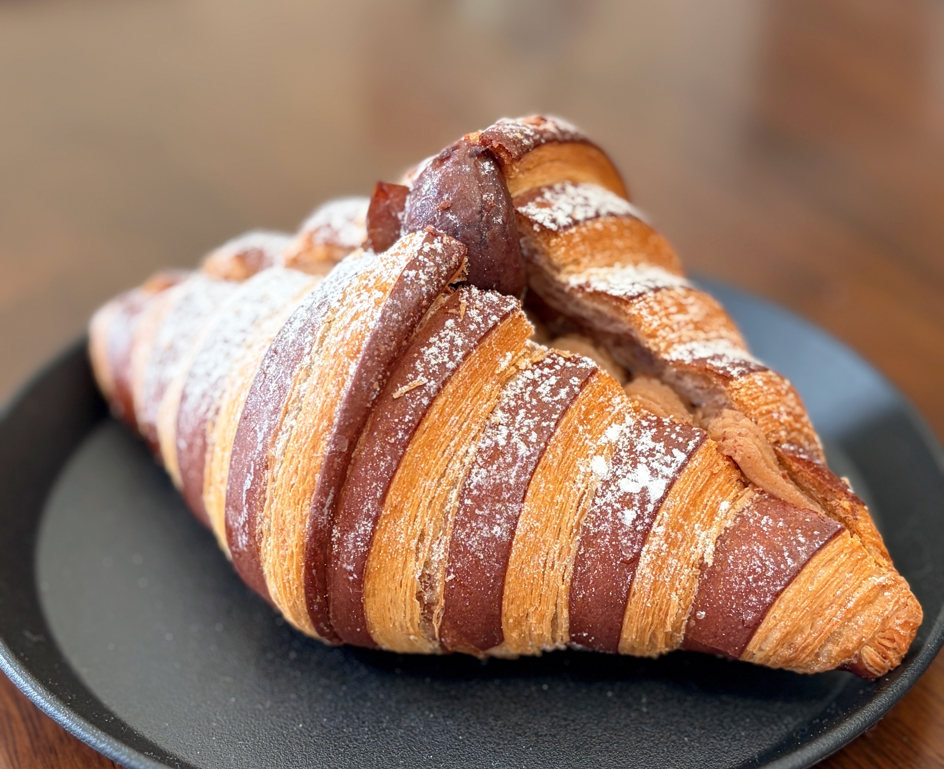 ひと目で惹かれるのが、バイカラーのクロワッサン。こんがり焼けた層の美しさに、粉糖がふわっと舞っていて、ショーケース越しでも“絶対おいしいやつ”感が伝わってきます。