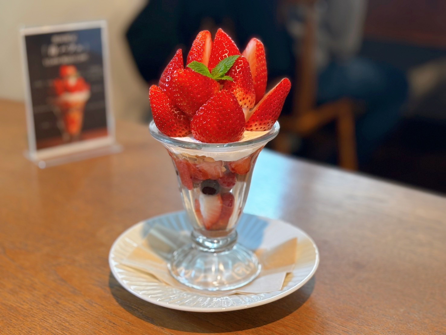 まず印象的だったのが、グラスの上にたっぷり盛り付けられたいちごです。真っ赤ないちごが花のように美しく並べられていて、パフェ全体がとても華やか。トップに添えられたミントも良いアクセントになっていて、写真映えも抜群でした。