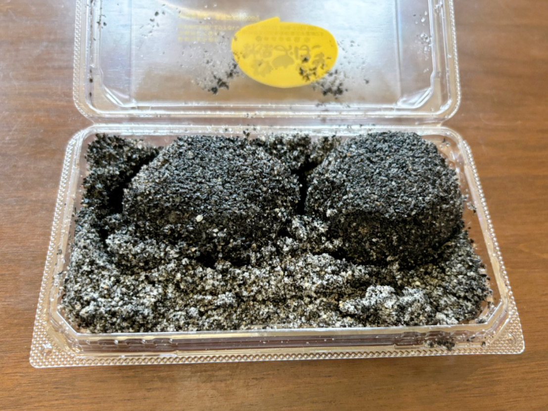 最後に「ごま」。パックを開けた瞬間から黒ごまの香りが立ち上がり、食欲を刺激します。表面には細かくすりつぶされた黒ごまがびっしりとまぶされており、その量の多さに驚かされます。ひと口食べると、ごまの香ばしさとほんのりとした甘みがもち米と絶妙に絡み合い、口の中いっぱいに広がります。特にごまの風味が好きな方にはたまらない一品で、あんこやきなことはまた違った魅力を楽しめます。