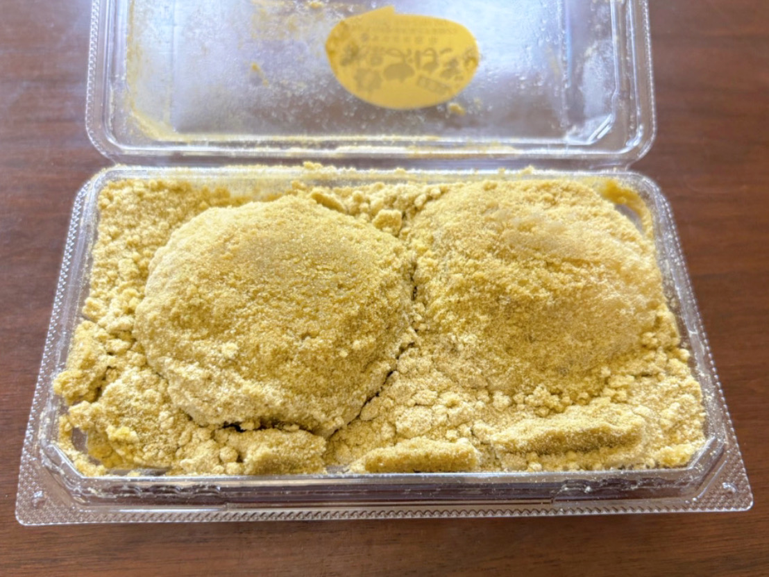 続いて「きなこ」。表面には香ばしいきなこがたっぷりまぶされていて、開けた瞬間から香りの良さが際立ちます。きなこの香ばしさとほのかな甘みがもち米の素朴な味わいを引き立て、後を引く美味しさ。量も十分で、ひと口ごとにきなこの風味がしっかり楽しめます。シンプルながら飽きがこない味わいで、幅広い年代に愛されるのも納得です。