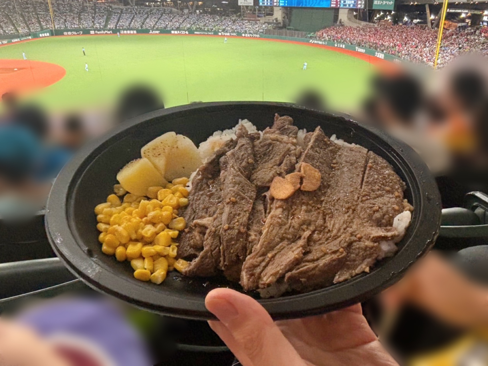 ステーキの上には香ばしいガーリックチップが散らされ、食欲を一層かき立てます。しっかりとした肉の食感を楽しみながらも、噛むほどに肉汁があふれ出す満足感は、まさに球場グルメの枠を超えたクオリティ。付け合わせにはホクホクのポテトと甘みのあるコーンが添えられており、ステーキとの相性も抜群です。肉の力強さを堪能しつつ、バランスよく食べられる構成になっているのも魅力です。