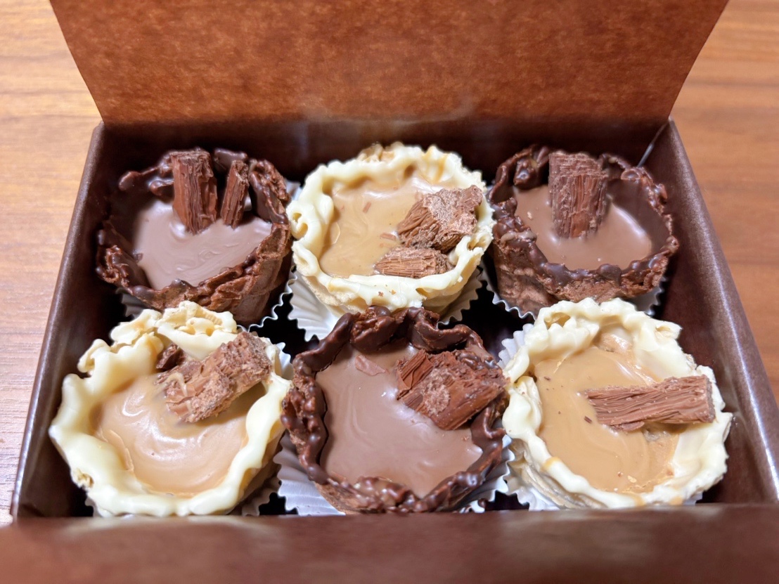 箱を開けた瞬間に目を引くのは、ころんとしたミニサイズのワッフルタルトが整然と並ぶビジュアル。見た目の可愛さはもちろん、香りの時点で“チョコレート専門店らしさ”がしっかり伝わってくる一品でした。