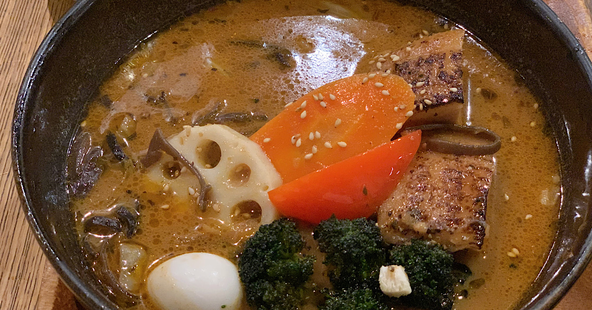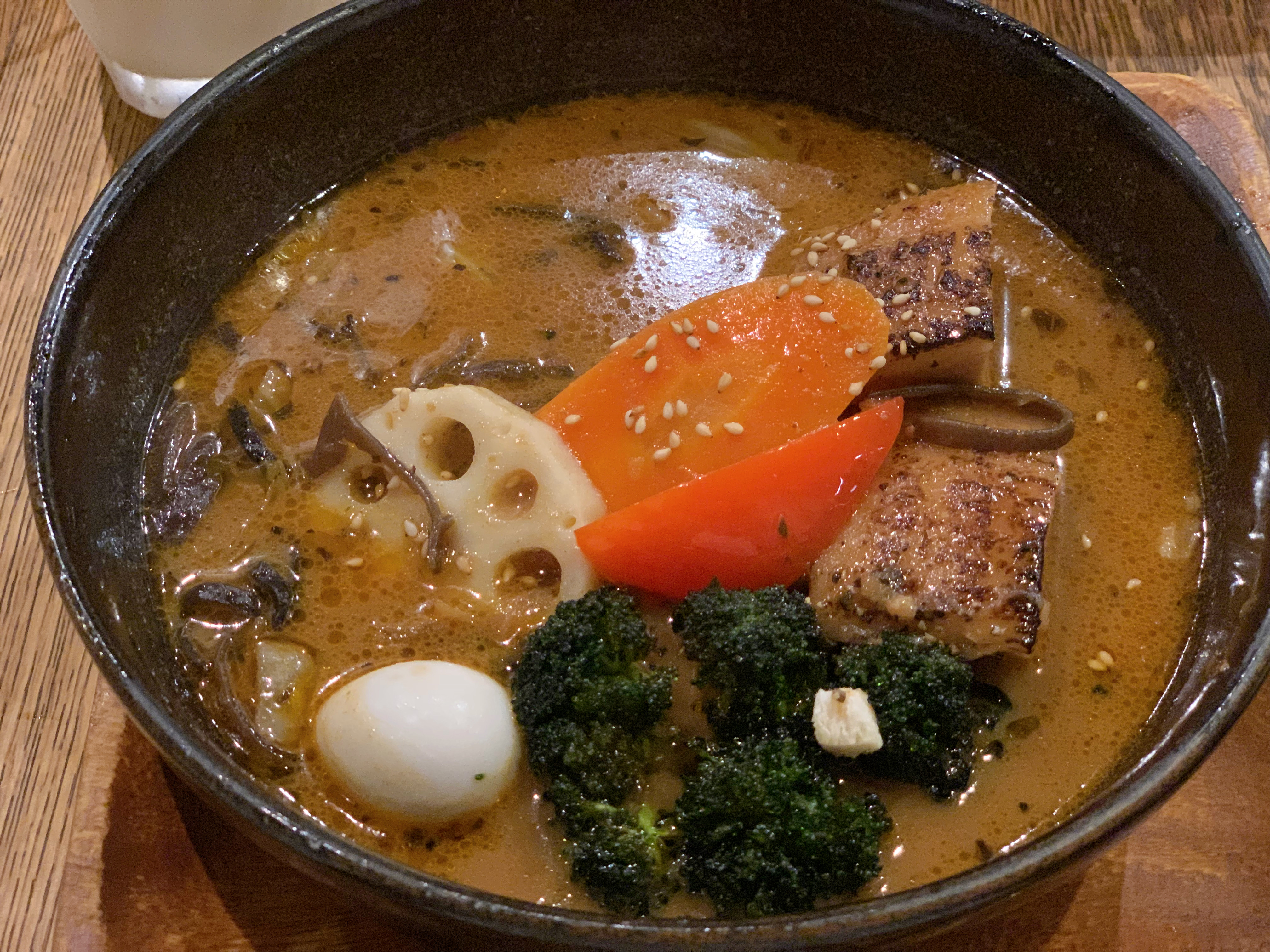 スープカレーの魅力のひとつが野菜の存在感。GARAKUでも、にんじん、ブロッコリー、レンコン、さらにウズラの卵まで盛り込まれ、見た目にも華やか。ひとつひとつが大きめにカットされているので食べ応えがあり、野菜の甘みや歯ごたえがスープの中でアクセントになります。特に炙り野菜の香ばしさは、スパイスの効いたスープと相性抜群でした。
