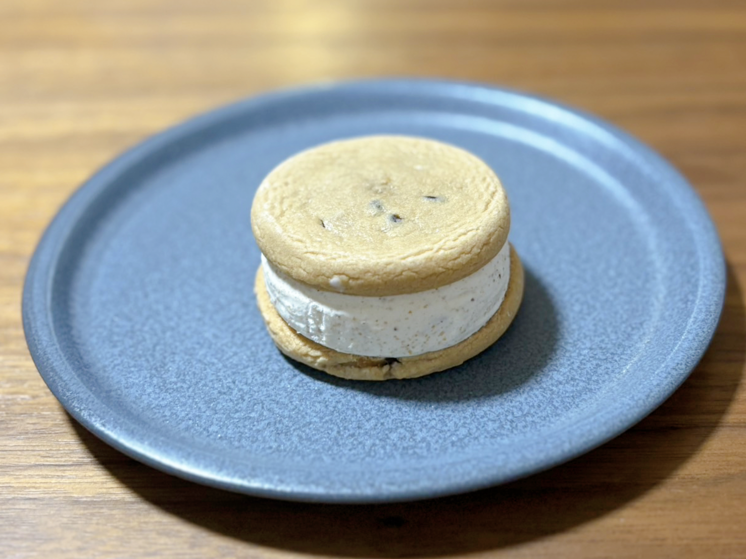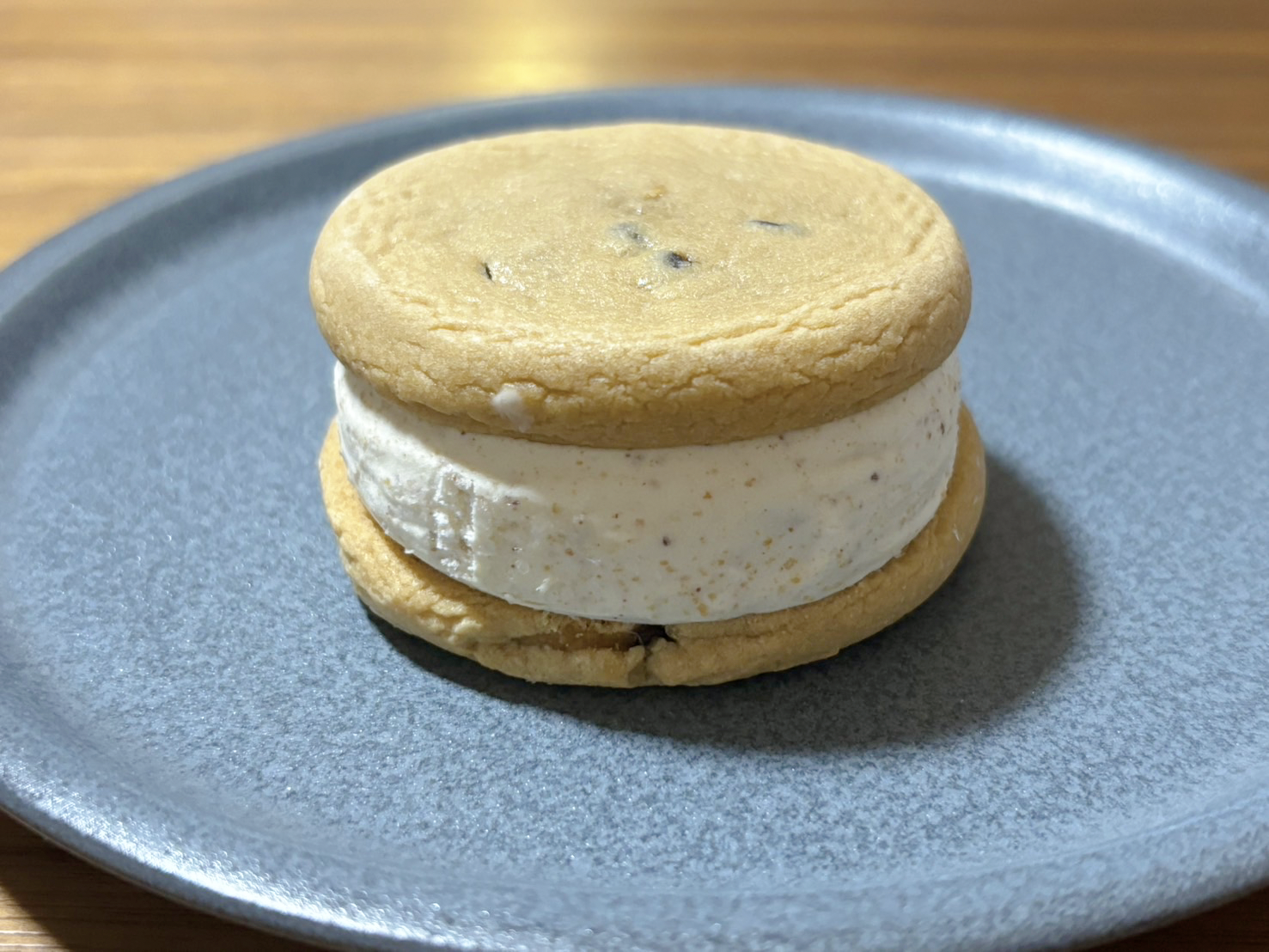 パッケージから取り出すと、しっとりとした丸いクッキーが上下に1枚ずつ。その間に、厚みのあるアイスがたっぷりサンドされています。サイズ感もしっかりしていて、手に持つとずっしりとした重みを感じるボリューム感。お皿にのせると、シンプルながらも存在感のあるビジュアルで、「今日はちょっと贅沢なアイスを食べるぞ」という気分になります。